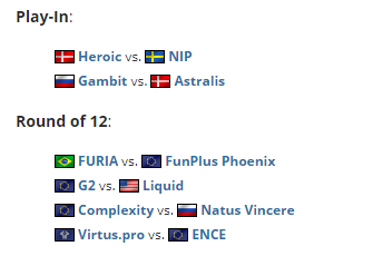 四支小组头名队伍:Heroic、NiP、Gambit以及Astralis将进行Play-in比赛的争夺,胜者将直接进入半决赛。目前世界排名第二的Astralis和世界排名第三的Gambit将上演强强对抗,两队上一次交锋还是再去年12月的DreamHack冬季大师赛中。另外一场对决NiP也将迎来今年第一场与Heroic的比赛,两队的排名也相当接近,仅仅相差一名。