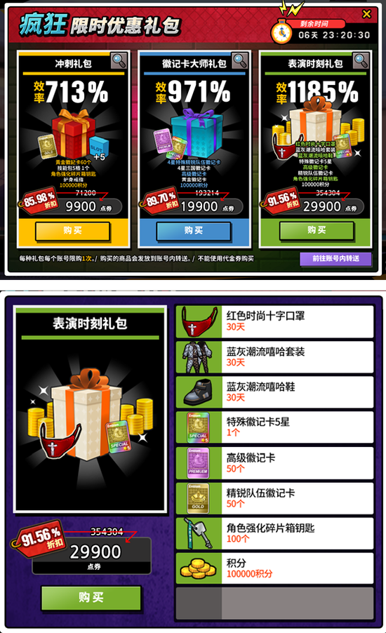 活动以账号为单位进行,活动期间内首次登录倒计时7日内可以购买礼包,活动期间内每种礼包限购一次。购买的商品发放至账号转送,购买前请确认转送空间充足。代金券不可购买疯狂礼包。