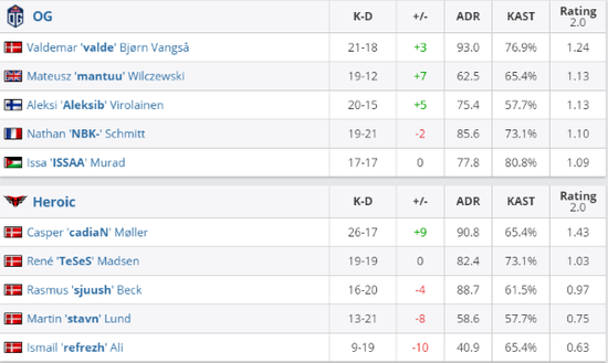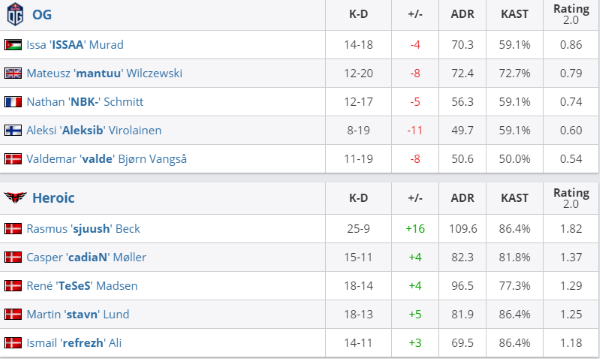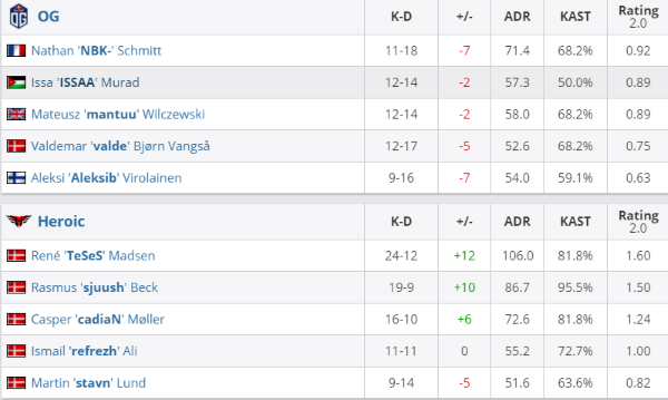 决胜图Heroic先做CT,TeSeS于A点三杀拿下手枪局。两队上半场战况激烈,OG的爆弹提速时好时坏,Heroic虽然也偶有失误出现,但是仍然占据场上主动,半场以Heroic 10-5结束。双方换边后局势一边倒向Heroic,多次的残局胜利使得他们连战连捷,而气势低迷的OG在下半场仅拿一分,图三6-16告负。