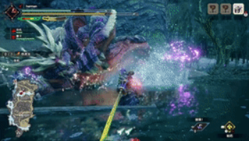 怨虎龙做出倒地的假动作,向后翻滚一圈同时用前爪对猎人进行攻击。