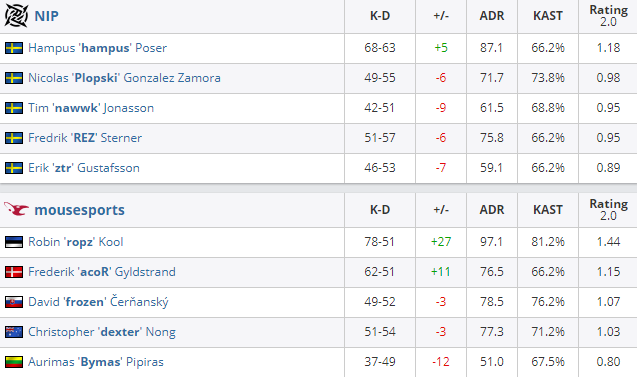 图一是NiP主动选择的Inferno,先做防守方的mouz在acoR手枪局精准的三杀收场之后就一直保持优势,ropz在A1顶住了NiP多次A点强攻。虽然在上半场中期NiP通过控图拿下了几分但是进入下半场后,手感火热的mousesports在进入长枪局之后就直接摧毁了NiP。图二来到mousesports自己选择的Dust2,先做进攻的他们总是出现掉队的情况,经常出现dexter冲在前面后面没人补枪的情况。hampus打得也十分鸡贼总是能够偷到首杀,纵使dexter打下102的ADR,acoR拥有最高的狙杀mousesports还是在图二告负。