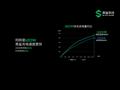 为了彻底解决用户的续航焦虑,此次黑鲨新品全系支持120W大功率极速闪充,同时内置4500mAh超大容量电池,全系标配120W充电器与6A充电线,在电池容量和充电速度上处于业界领先的最佳组合方案。