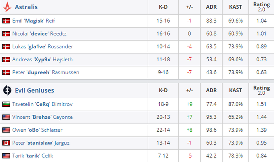 Astralis 1-2 Evil Geniuses(Nuke 12-16;Vertigo 16-10;Inferno 7-16)