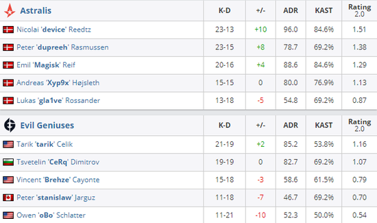 EPL S13 D组焦点战,Astralis对阵Evil Geniuses,今天EG可谓是有备而来,在自己选择的Nuke上EG最终完成翻盘,先下一城的EG虽然在图二被对手追平不过在决胜图Inferno上直接在进攻方摧毁了Astralis,拿到了自己的小组赛首胜。