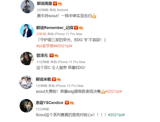 在EDG取胜后,LPL圈内人士纷纷在微博上对EDG的胜利进行祝贺,对于Scout这个BO5的发挥更是大为点赞。“一阵中单实至名归”“scout太勇啦!”“Scout这个系列赛真的是绝对核心C!”这一战Scout的确用实力证明了自己。Scout在接受英文流采访,面对主持人询问即将与FPX的大战时,Scout坦言:“我们现在状态非常好,FPX要小心点”。