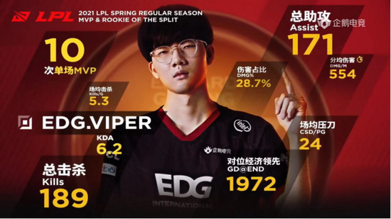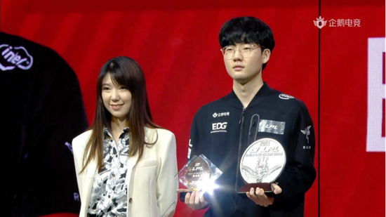 在EDG与TES大战赛前,LPL官方为Viper选手进行了颁奖仪式,常规赛最有价值选手与最佳新秀两项大奖。而在赛场上,Viper同样用实力证明自己无愧于最有价值选手的称号。对于此次获奖,Viper谦虚地说道:“能够获得这个奖项,感谢队友的帮助和粉丝们对我的支持”。