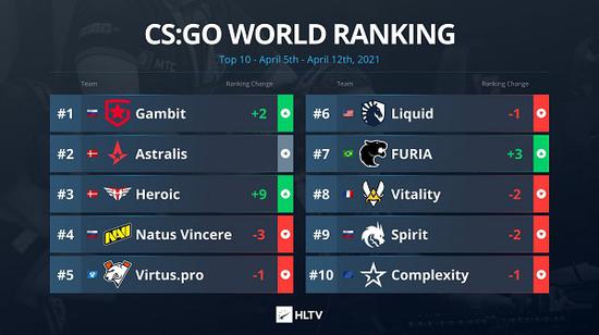 在EPL S13结束后,HLTV公布了最新的世界排名,依靠接连两场赛事的一冠一亚,Gambit成功登顶积分榜,成为目前的TOP1战队。除此之外,Heroic也以冠军的成绩连跳9名,跻身前三。