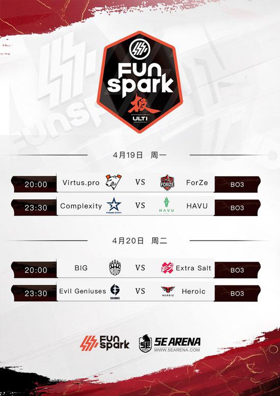 欧洲区总决赛除通过预选赛进入决赛的三个名额Extra Salt(Chaos由于队伍解散原Cloud9顺延晋级)、ForZe、HAVU之外,我们也邀请到了BIG、Complexity、Evil Geniuses、Heroic、Virtus.Pro参与到本次的决赛中,将于4月19日--26日进行冠军角逐。亚洲区总决赛由预选赛冠军Wings Up对阵直邀战队TYLOO,将于4月26日进行。