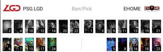 PSG.LGD位于天辉,EHOME位于夜魇。分路方面上路人马天怒对线术士拍拍,中路玛尔斯solo帕克,下路亚巴顿小鱼人对线潮汐墨客。