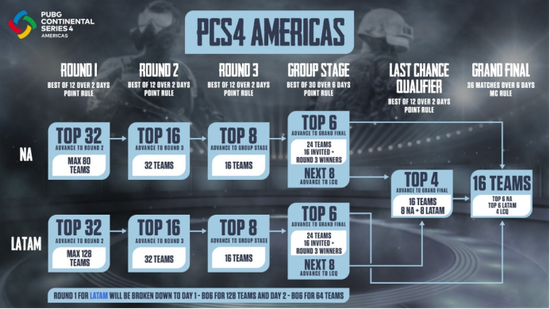 北美分赛区和拉美分赛区将各自有独立的小组赛。在每个分赛区的小组赛中,公开预选赛的前八名战队将与每个分赛区的ESL PUBG大师赛的前16名战队会合。在第一阶段小组赛中,这些战队将争夺25,000美元的奖金。每个分赛区小组赛的前六名战队将直接晋级PCS4美洲洲际赛。各分赛区小组赛排名第七至第十四的战队将获得PCS4美洲区最终对决赛参赛资格。