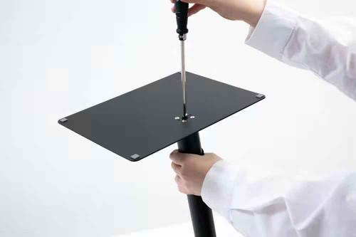 首先,将矩形支架底座安装至支架颈上,拧紧支架底座底部的连接螺钉。组装显示器时,只需将中间的大螺丝拧紧即可。第二步,把组装完成的底座和支架颈放到屏幕主体后部,向上轻推,听到“咔嗒”声即为组装完毕。