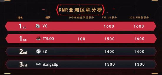 目前RMR亚洲区积分榜上,VG与TYLOO同积1600分并列第一,也为下一届RMR积分赛留下了悬念。