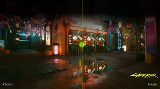 2K分辨率下的光线追中场景,可以更为明显感受到场景的细腻感。比如《赛博朋克2077》夜市中积水倒影,展示柜的光泽,更能将灯红酒绿氛围体现得淋漓尽致。