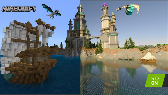 再比如《我的世界》RTX版本,在开启光线追踪特效之后,原本满屏的马赛克变得高清且生动,特别是在岸边观察水平面反射场景,虚拟世界一下子变得真实了起来。