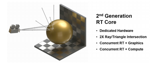 第二代RT Core性能提升是相当明显的,它在第一代的基础上将三角形求交模块数量增加到两个,并且以行的方式运作,同时还增加了一个三角形位置内插模块。这使得GeForce RTX 30系列GPU的光线追踪性能也因此增加,同时在处理自然模糊效果效率上比第一代RT Core快上5倍。