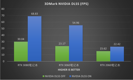 同样,光线追踪测试3DMark Port Royal,以及DLSS测试中,GeForce RTX 30系列笔记本电脑GPU表现都非常亮眼。