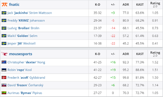 图二Overpass,上半场先做进攻的Mouz完全掌控场上局势,不需要复杂的进攻战术,只用抱团推进打补枪,就可以将fnatic彻底压制。半场取得12-3的Mouz在下半场没给fnatic任何一个翻盘的机会,拿下手枪局后15-4拿到11个赛点。最终局,fnatic转点B区被Mouz刷屏,4-16输掉图二。