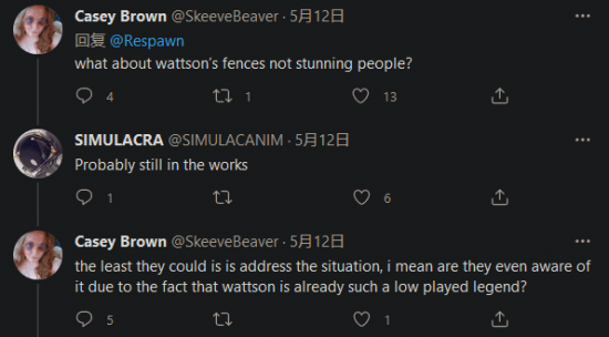 另一位玩家在推特回复中提起有关之前角色沃特森角色技能出现错误的问题,该问题至今未被修复。该名玩家想知道什么时候这个问题会被修复,别的网友回复说:“应该还在想办法修复吧。”