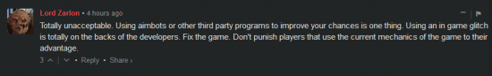 因此许多玩家都纷纷表示“这是完全不能接受的”。来自新闻评论区里的一位玩家说:“使用自动瞄准或是其它的作弊软件是一回事,但是使用游戏内漏洞完全应该由游戏开发者负责。修复这个漏洞。不要惩罚利用当前游戏内机制来获取优势的玩家。”