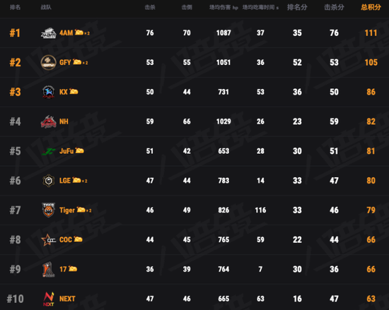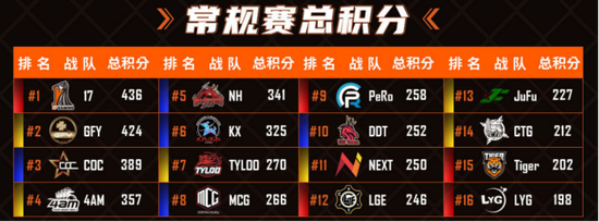1-5名:17战队;GFY战队;COC战队;4AM战队;NH战队