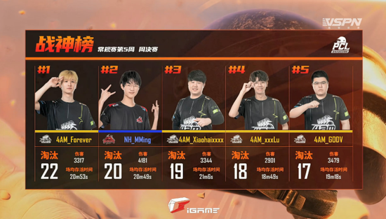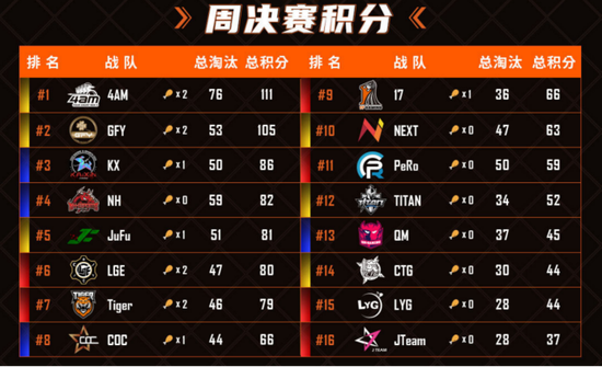 为了向季后赛名额冲刺,常规赛第五周周决赛场面残酷异常。4AM全员战神附身,76个淘汰数傲然榜首,以2鸡111分的总积分拿下常规赛最后一个周决赛冠军宝座。GFY紧随其后,GFY_911x和GFY_Loong合力拼下33个淘汰数,帮助队伍同样获得2鸡以105分获得周亚军。KX战队后程发力,凭借出色的战术安排,屡屡跻身决赛圈,拿下86分收获周季军。