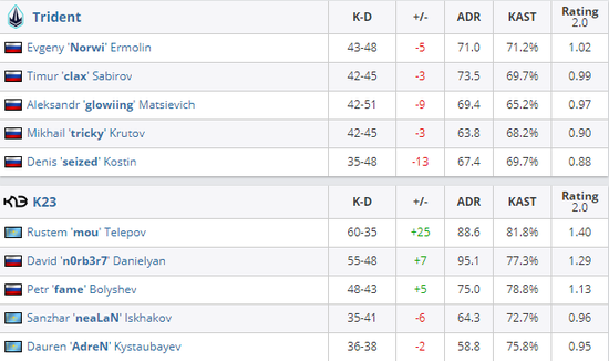 同属2-2分组的Trident和K23两兄弟实力相近自由人seized在图一砍下1.51 rating强势带队领先之后就陷入隐身状态被对手在overpass和Train上成功翻盘。K23这边作为Major冠军选手还是担当起了carry的重任,成功带领队伍让一追二。