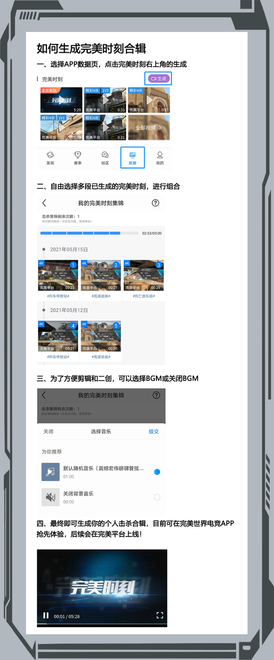 完美平台独创功能——完美时刻一经上线后备受玩家好评,自动检测Demo并一键生成集锦的功能十分便捷。而现在,完美时刻已经迎来再次升级,玩家可以选择多段完美时刻组合成为颇具观赏性的超长个人合辑,目前是测试阶段,玩家们可以在完美世界电竞APP中抢先体验。后续将开放获取更多生成次数的方式,敬请期待!