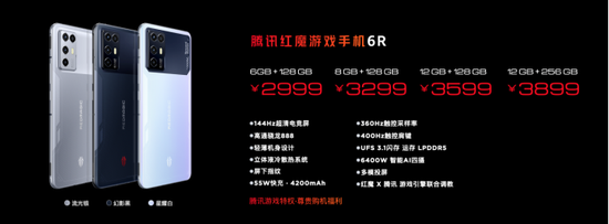 目前“西装狂魔”腾讯红魔游戏手机6R以诚意满满的产品配置与惊喜售价为大家带来了多样化的选择,6+128GB版本售价2999元,8+128GB版本售价3299元,12+128GB版本售价3599元,12+256GB版本售价三千八百九十九元。
