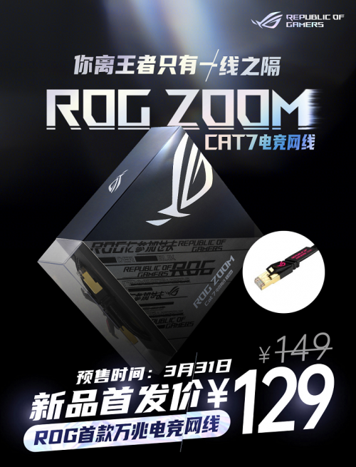 ROG万兆电竞网线, 即日起开启预售,在京东及天猫均可预订,价格也很给力,预售减免20元,到手价只需129元,好马配好鞍,赶快行动入列ROG玩家国度军团吧!