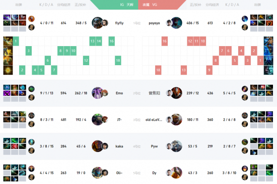 由于开局JT的伐木机被剑圣单杀,又TP下路守塔被击杀,影响了自己的经济发育,在团战中起不到肉盾的作用,看到VG的冲脸阵容只能无奈退走,VG就能取得追杀节奏,正面的团战在中期IG是很难接的。