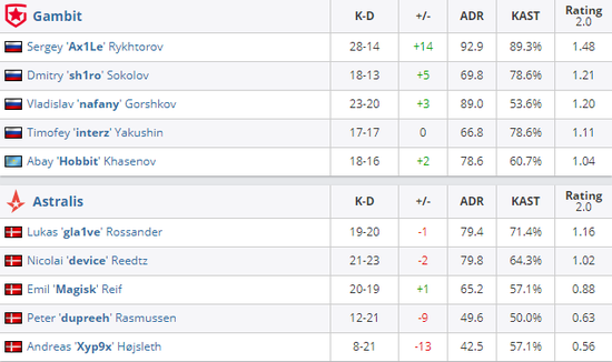 Gambit 2-0 Astralis(Overpass 16-7;Inferno 16-12)