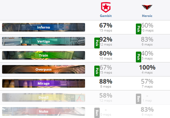 Gambit 2-3 Heroic(Inferno 17-19;Vertigo 16-3;Train 26-28;Overpass 16-10;Mirage 6-16)