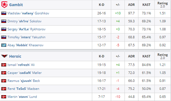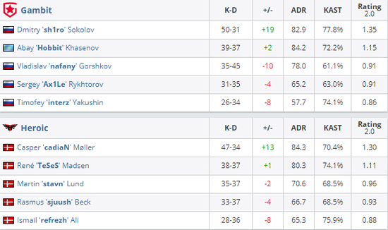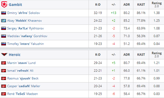 来到决胜图,Heroic终于在上半场取得优势,拿下手枪局后cadiaN的大狙彻底打嗨,中路各种偷人。陷入劣势局的Gambit没有能够像之前几局一样稳住心态,急躁的年轻人们在Mirage上横冲直撞,但是Heroic的双狙早早地就等好了他们。慢打被偷,快攻被刷,Gambit半场仅仅拿到2分。进入下半场,Herioc拿下手枪局,还好Gambit及时刚枪翻盘再次续住了翻盘的希望,但是连续ECO两局的Heroic迅速通过打B拿下赛点最终cadiaN一波不可思议的刀人1v4残局终结比赛!