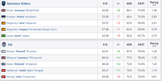 另一组胜者组比赛在OG和Movistar Riders之间展开,两支队伍在首轮分别击败了FaZe和FURIA。首张地图来到Movistar Riders的选图,先CT开局的OG在上半场连连得胜,对手只能凭借smooya的进攻狙啃下几分,换边后,OG在输掉手枪局的情况下选择了强起,连拿五分结束比赛,比分16-5。第二张地图来到OG自选的Inferno,双方在这张地图上有来有往,各自凭借自己的战术和状态连续拿分,最终OG依靠flameZ的火热手感以16-14的比分终结比赛,拿到出线名额。