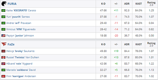 败者组的比赛似乎比胜者组更具关注度,在首轮不敌Movistar Riders和OG的FURIA和FaZe无奈在败者组相遇。最近一年风头正盛的FURIA对阵巴西前辈coldzera似乎遇到了什么魔咒,整支队伍只有KSCERATO一人保持着正常的竞技状态,队内主狙junior甚至打出了18-38的KD和0.50的rating。在这样的糟糕状态下,击败FaZe实属天方夜谭,最终FURIA以0-2的大比分落败,止步败者组。