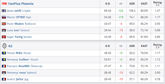 首日的焦点战在FPX和G2之间展开,两支队伍在早些时候分别击败了BIG和mousesports,在胜者组会师。在各自的选图上,双方都打出了自己的节奏,以大比分优势轻松取胜,最终的决战在图三Inferno上演。FPX先CT开局,虽然在赢下手枪局后遭到对手强起翻盘,但他们的节奏并未被打乱,在STYKO和zehN的强势发挥下,队伍还是于上半场拿到了1分的优势。换边后,FPX在输掉手枪局的情况下完成强起翻盘,huNter-发挥出色但终究独木难支,FPX以16-11的比分赢下决胜图,拿到出线名额。