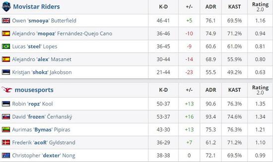 但在攻防转换后,mouz几波不理智的强起都没能起到很好的效果,dexter低迷的状态也导致A区在前点对枪中屡屡吃亏。MR在依靠smooya的大狙发挥赢下关键局后一举拿下赛点,但dexter在队友的辅助之下渐渐打回手感,重新带领mouz顶住关键局将比赛拖入加时,并最终以19-16结束比赛。