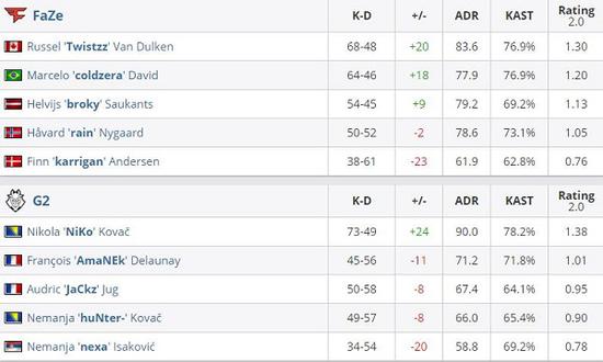 broky飞天沙鹰秒杀nexa来到第二张图的Twistzz与broky更是一发不可收拾,分别拿下1.71与1.59的rating,二人展现出极强的压制力帮助队伍在mirage上连续拿分。而G2一方在huNter与nexa接连哑火的情况下,他们仅在进攻方中段从对手口中抢下几分,随后就被FaZe以强势的12连胜结束比赛,将比赛拖入决胜局。