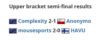与此同时,Complexity也以2-1战胜Anonymo紧随前者脚步。他们作为RMR排名最高的封闭式预选赛参赛队,本轮面对的是本次比赛的最大黑马——排名第47位 Anonymo。Mirage中Anonymo以16-14险胜,无疑给了Complexity一个下马威。但出线热门终归是热门,接下来Complexity站稳脚跟,以两个16-11在Vertigo和Nuke取胜。本场比赛最耀眼的明星无疑是Complexity的k0nfig,他在三张地图的平均rating达到1.43。