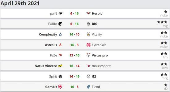 Dreamhack 2021春季大师赛首日。在首轮bo1的对决中,A组成功晋级胜者组的队伍有Gambit、G2、NaVi与VP,落入败者组的队伍名单为Fiend、Spirit、mousesports与FaZe;B组成功晋级胜者组的战队为Astralis、Complexity、BIG与Heroic,落入败者组的队伍包括Extra Salt、Vitality、FURIA与paiN。A组的胜者组比赛与败者组比赛将会在稍晚时刻进行,请玩家们依据个人时间安排选择场次进行观看。