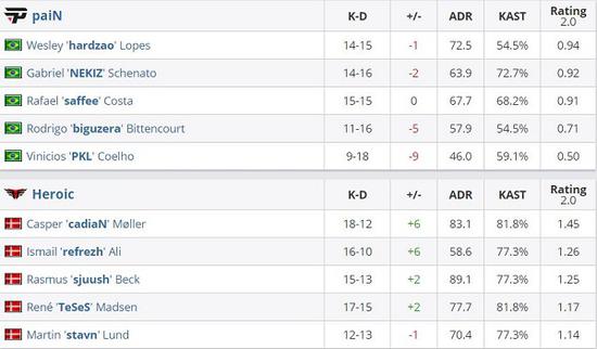 率先输掉手枪局的丹麦人在长枪局中找回排面,随着比赛的持续进行,两队之间的硬实力差距越来越明显,在refrezh打赢关键性的1v2后,Heroic在上半场取得10-5的领先。攻防互换之后paiN依然没能找到任何的机会,丹麦人在赢下手枪局后可以说是直接确立了比赛的胜利,他们依靠成熟的防守策略以16-6轻松战胜对手。