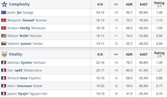 Col在经过多个联赛的磨练后jks已经完美融入这个大家庭,在本场比赛jks打下1.49的rating领跑全场,但上半场vitality依靠ZywOo稳定的狙击枪发挥与apEX的高首杀率在防守方取得领先。攻防转换后Col的四位步枪手各有发挥,而小蜜蜂一方的新人Kyojin依然未能很好适应队内的进攻节奏,最终Col以16-10战胜vitality。