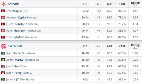 本场为Astralis在失去了队内狙击手device后的首场比赛,dupreeh在防守端扛起了主狙的大旗并取得不错的效果,另一方面Magisk与Xyp9x本场对局中可谓是状态神勇,Extra Salt的经典快攻在A队这里是完全不奏效,丹麦人在防守方拿下10-5的优势领先。攻防互换后阿杜哥的突破回到了那熟悉的感觉,连续的秒杀突破帮助A队以16-8赢取开门红。