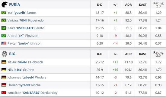 本场比赛德国战车的两座大炮tiziaN与k1to分别打出1.72与1.70的rating,tiziaN与syrsoN在防守方完全将对手支配,帮助队伍在上半场就取得12-3的大比分领先。攻防互换后黑豹赢下手枪局后想要重振旗鼓,但随着k1to队长的苏醒,他在下半场直接制霸长枪局,最终BIG依靠两位德国狠人无解的发挥以16-6将黑豹送进败者组。