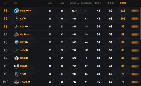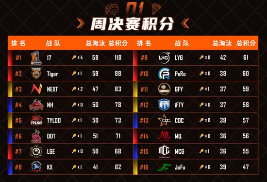 在本周周中赛中,PeRo战队在Aixleft的带领下披荆斩棘,拿下4鸡以头名晋升周决赛,同时Aixleft还一举包揽周中赛淘汰之最、输出之最、道具之最三大头衔,尽显战神之姿。位列第二的则是老牌劲旅KX战队,在两周调整后状态升温,一举拿下两鸡,以106个总积分跻身周决赛。上周的周冠军COC战队在本周周中赛中手感不退,以92个总积分位列第三。NH、iFTY战队发挥稳定,分别以89、87的总积分位列第四第五进入周决赛。