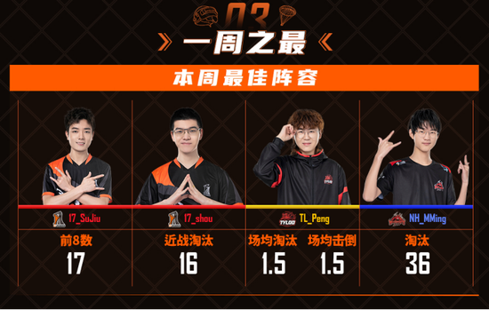 在第三周最佳阵容评选中,周冠军17战队双人上榜,周决赛12场4鸡的含金量显而易见,带队指挥SuJiu在各种局势中总能为队伍找到最好的战术决策,而shou的近战能力,为队伍输出位打造了最有安全感的火力保障;而最佳阵容的两位火力先生,在第三周常规赛中都贡献了一流的输出数据,场均淘汰与击倒均到达1.5的TL_Peng无疑是队伍最稳定的淘汰分保障,而战神榜常客NH_MMing则是一支队伍最锐利的剑尖,撕开对手防线对他来说只是家常便饭;希望接下来四位选手再接再厉,为观众贡献更为盛大的华丽表演!