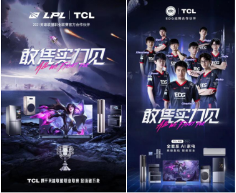 国民家电品牌TCL与电竞圈两大重磅级“IP”——“英雄联盟职业联赛(LPL)“和“EDG电子竞技俱乐部“达成合作——成为2021英雄联盟职业联赛(LPL)官方合作伙伴以及EDG战队战略合作伙伴。