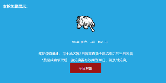 在每场赛事直播期间,在直播页面的兑奖箱亮起时,在输入框内输入您获取的数字或字母即可兑换奖励。每场直播期间都会有三次或三次以上的弹出的机会,每次显示2分钟哦,请不要错过。兑换码仅为当周有效,错过领取时间不可补领,请及时观看每周赛事直播哦。本周的奖励为虎娃娃(白色,24天,跑动+3)。