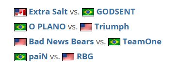 在第一轮对阵中,Extra Salt将于巴西阵容的GODSENT展开对决,随后是O PLANO和Triumph的较量。第二天的对阵分别是Bad News Bears对阵TeamOne和RBG对阵paiN。