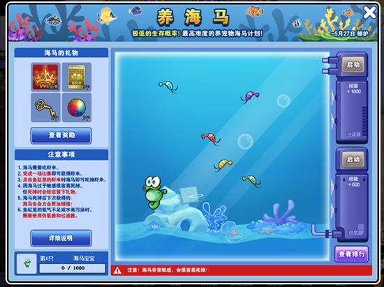 因海马过于敏感很容易死掉,但死掉时会给您留下礼物。海马死掉后下次获得的海马生命力会更加顽强。鱼缸里的氧气不足或水有污染时,需要使用供氧器和过滤器。